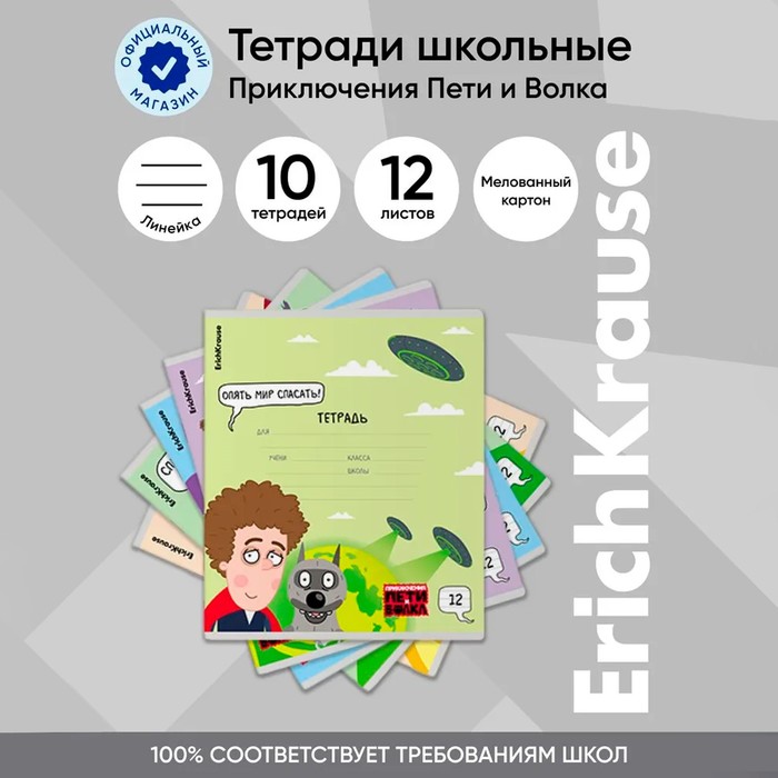 Тетрадь 12 листов в линейку, ErichKrause "Приключения Пети и Волка", обложка мелованный картон, блок офсет 100% белизна, МИКС