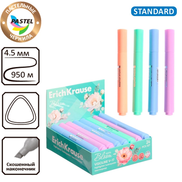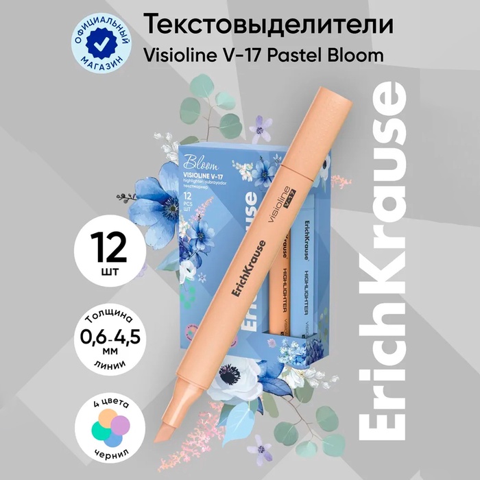 Маркер текстовыделитель ErichKrause Visioline V-17 Pastel Bloom, 4.5 мм, чернила на водной основе, МИКС