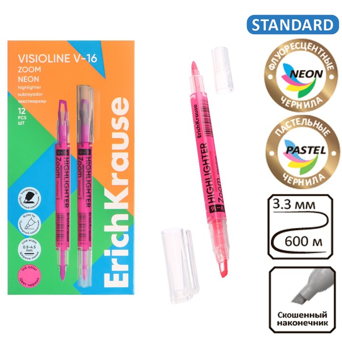 Маркер текстовыделитель 0.5-3.5 мм ErichKrause Visioline V-16 Zoom Neon, двухсторонний, розовый неон, чернила на водной основе