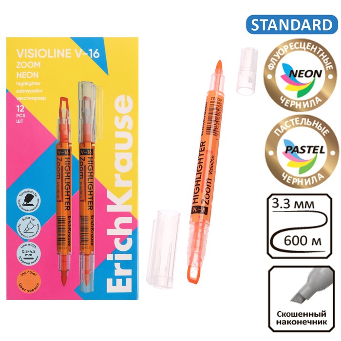 Маркер текстовыделитель 0.5-3.5 мм ErichKrause Visioline V-16 Zoom Neon, двухсторонний, оранжевый неон, чернила на водной основе