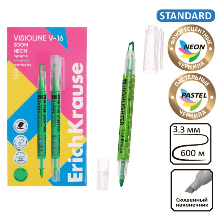 Маркер текстовыделитель 0.5-3.5 мм ErichKrause Visioline V-16 Zoom Neon, двухсторонний, зеленый неон, чернила на водной основе