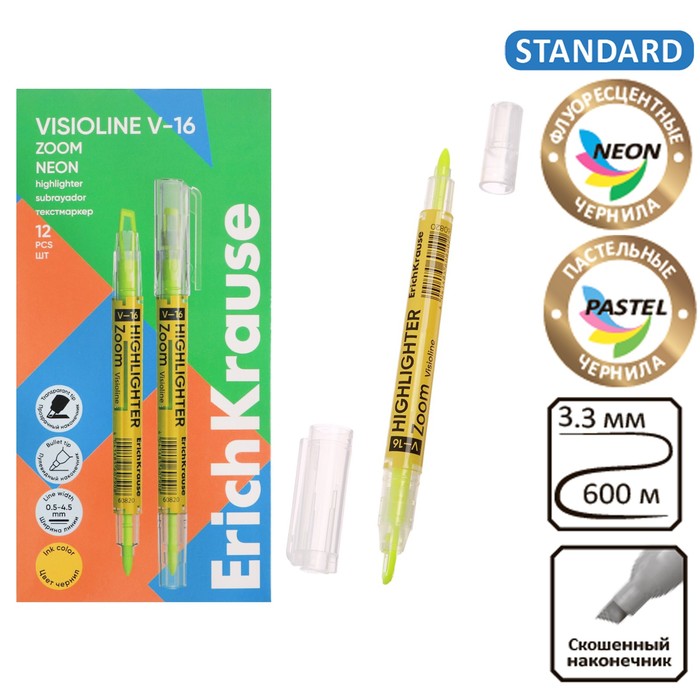 Маркер текстовыделитель 0.5-3.5 мм ErichKrause Visioline V-16 Zoom Neon, двухсторонний, желтый неон, чернила на водной основе