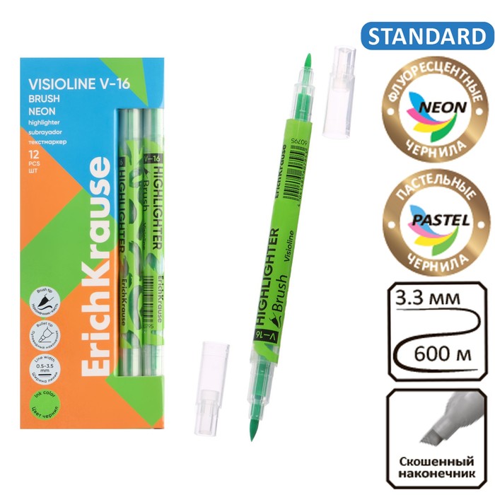 Маркер текстовыделитель 0.5-3.5 мм ErichKrause Visioline V-16 Brush Neon, двухсторонний, зеленый неон, чернила на водной основе