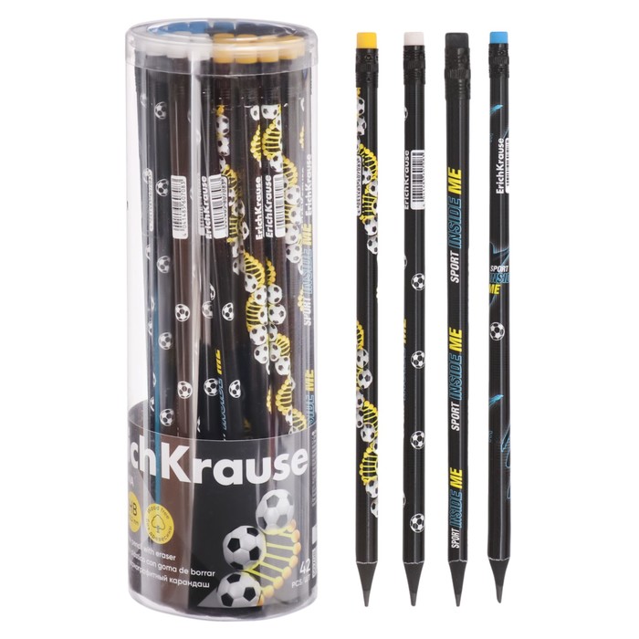 Карандаш чернографитный с ластиком ErichKrause "Sport DNA", НВ, грифель d=2,2 мм, пластик, круглый в тубусе, микс