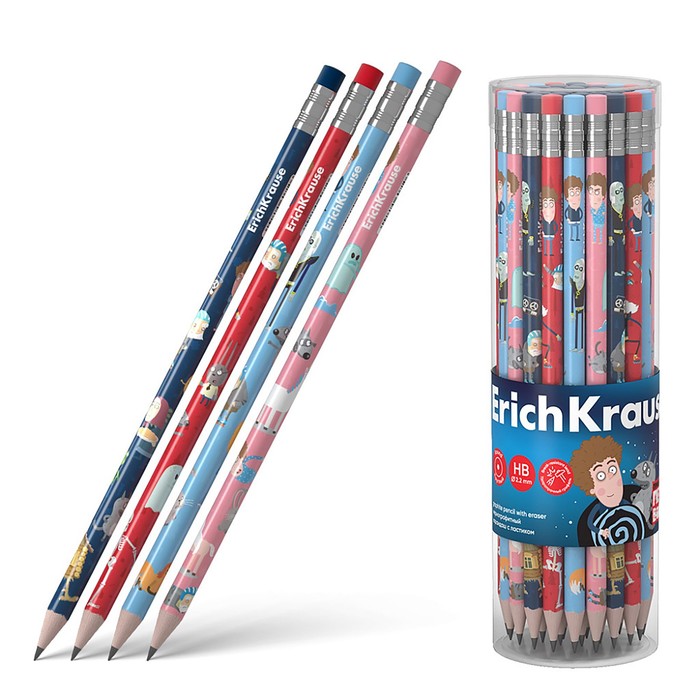 Карандаш чернографитный с ластиком ErichKrause "Приключения Пети и Волка", НВ, грифель d=2,2 мм, дерево, круглый в тубусе, микс
