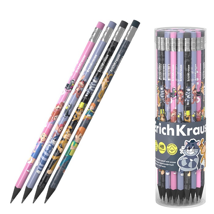Карандаш чернографитный с ластиком ErichKrause "Простоквашино", НВ, грифель d=2,2 мм, пластик, трехгранный в тубусе, микс