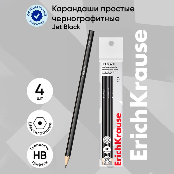 Набор чернографитных карандашей 4 штуки ErichKrause "Jet Black", HB, грифель d=2.2 мм, дерево, шестигранных, в пакете, чёрный корпус