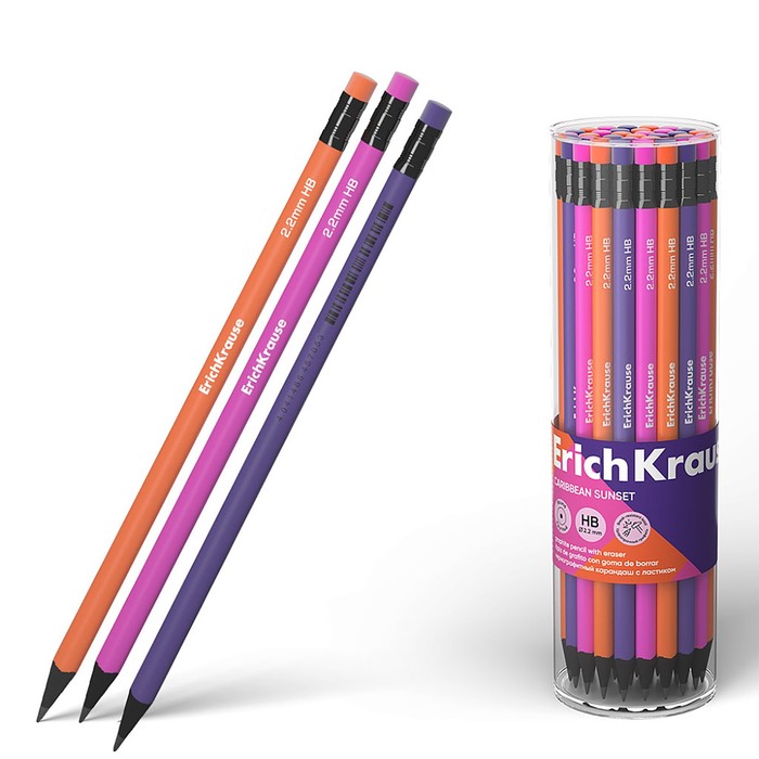 Карандаш чернографитный с ластиком ErichKrause "Caribbean Sunset", НВ, грифель d=2,2 мм, дерево, круглый в тубусе, микс