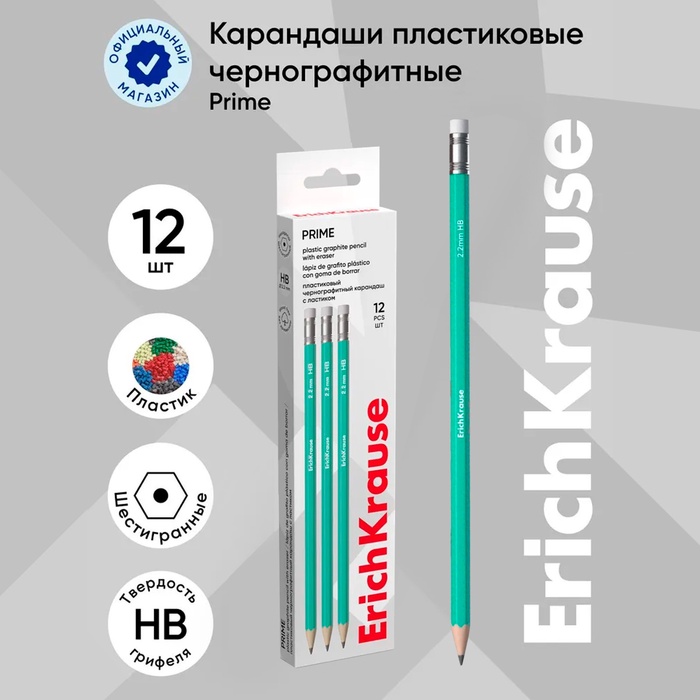 Карандаш чернографитный с ластиком ErichKrause "Prime", HB, грифель d=2.2 мм, пластик, шестигранный в коробке, зеленый корпус