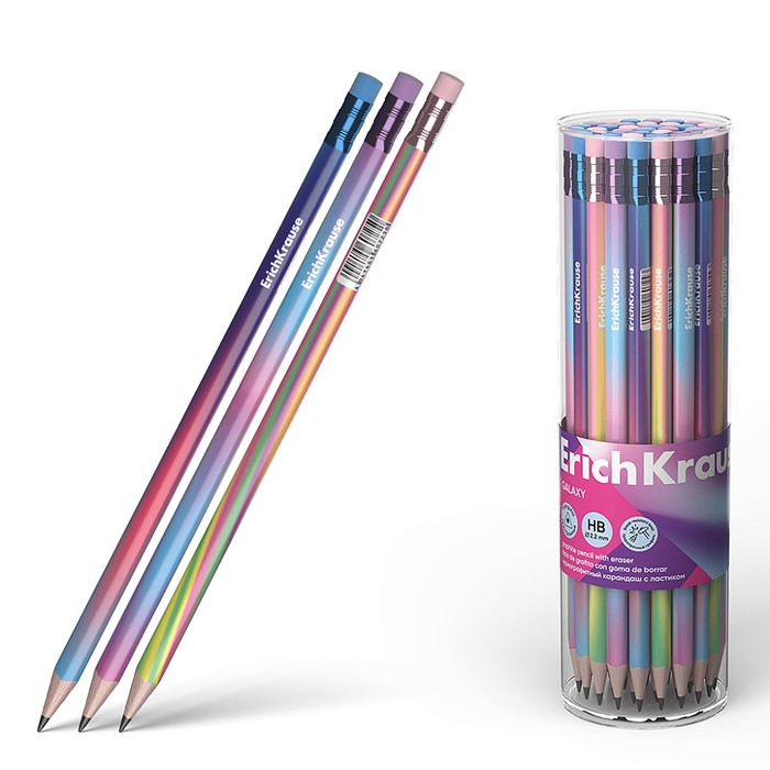 Карандаш чернографитный с ластиком ErichKrause "Galaxy", НВ, грифель d=2,2 мм, трехгранный в тубусе, металлик микс