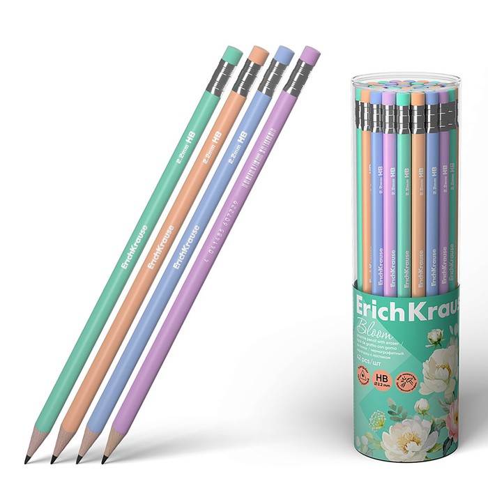 Набор чернографитных карандашей 12 штук HB ErichKrause "Pastel Bloom" дерево, трехгранных с ластиком