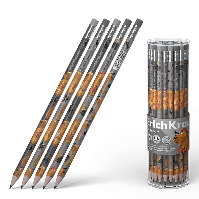 Карандаш чернографитный с ластиком ErichKrause "Happy Capy", НВ, грифель d=2,2 мм, пластик, круглый в тубусе, микс