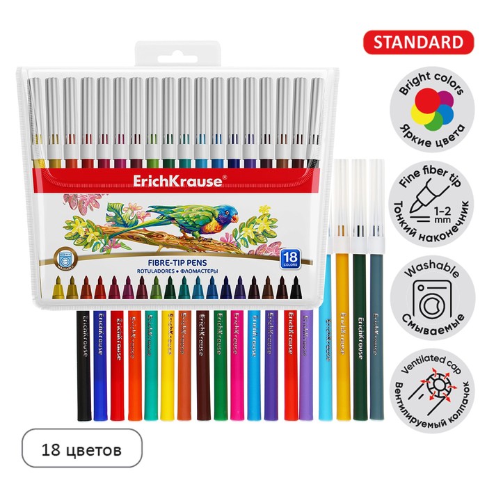 Фломастеры 18 цветов, ErichKrause, Washable, вентилируемый колпачок, блистер