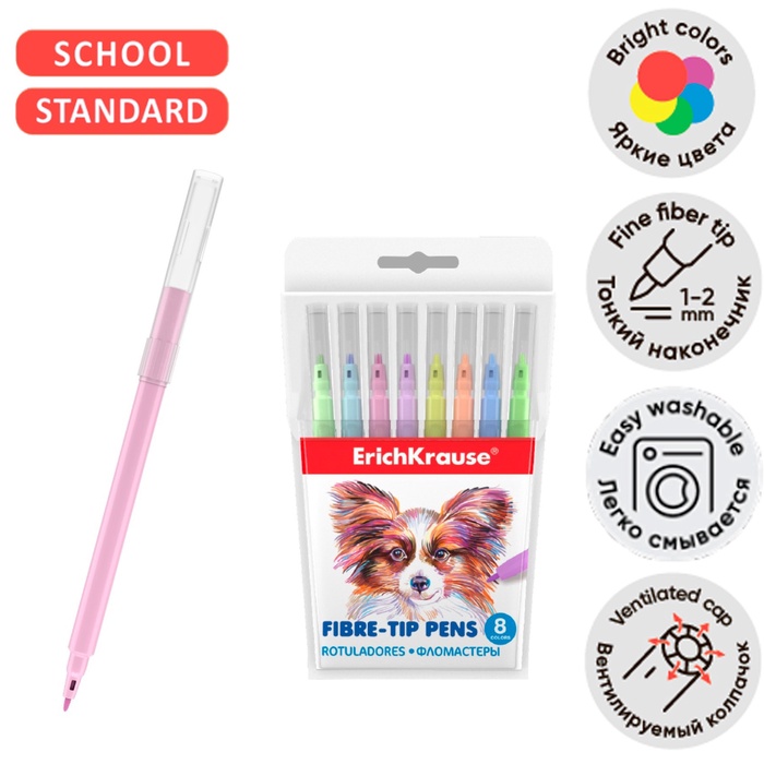 Фломастеры 8 цветов ErichKrause Easy Washable Pastel, смываемые, вентилируемый колпачок, европодвес