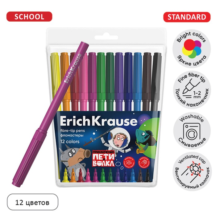 Фломастеры 12 цветов ErichKrause "Приключения Пети и Волка", в футляре с европодвесом