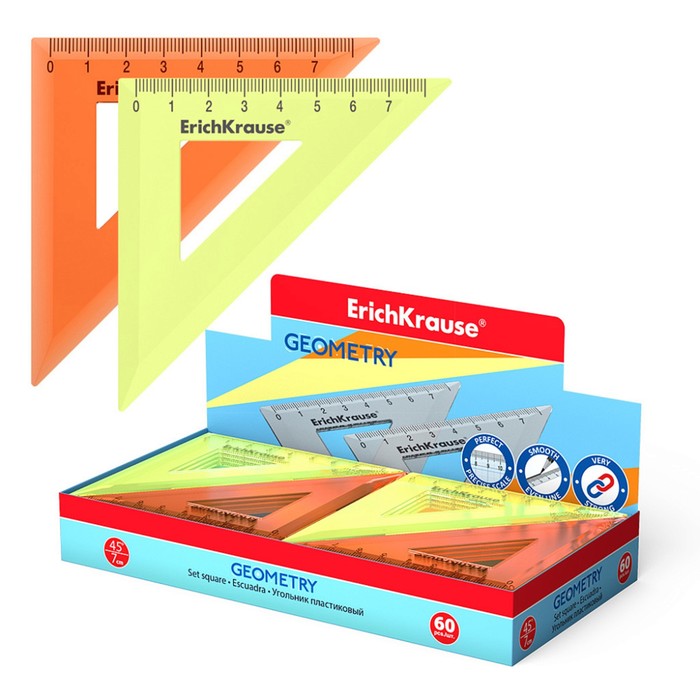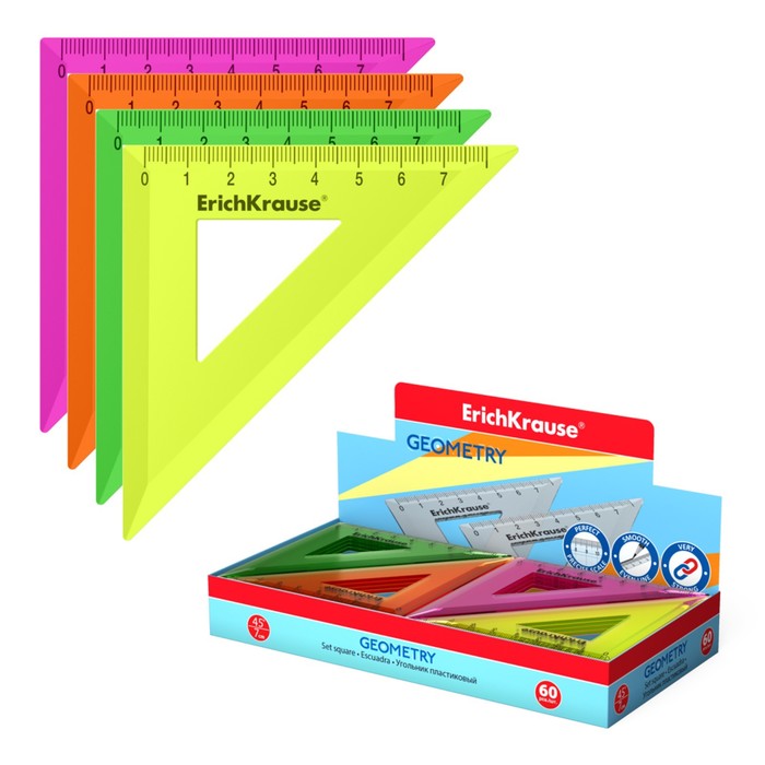 Треугольник 45*/ 7 см ErichKrause Neon Solid, пластик, микс из 4 цветов, в коробке-дисплее