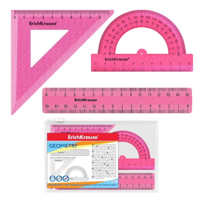 Набор чертёжный ErichKrause Glitter, малый (линейка, угольник, транспортир), в пакете, розовый