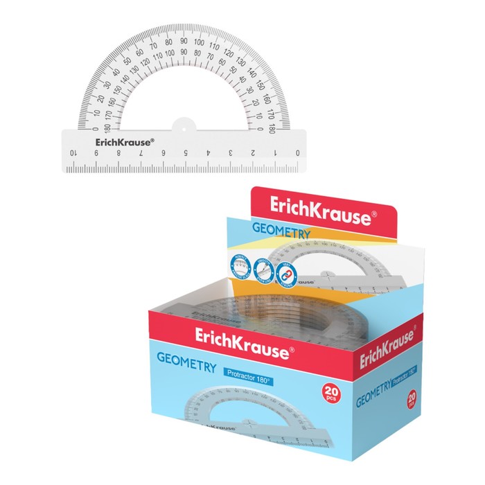 Транспортир 10 см 180°, ErichKrause "Clear", пластик, прозрачный, коробка-дисплей