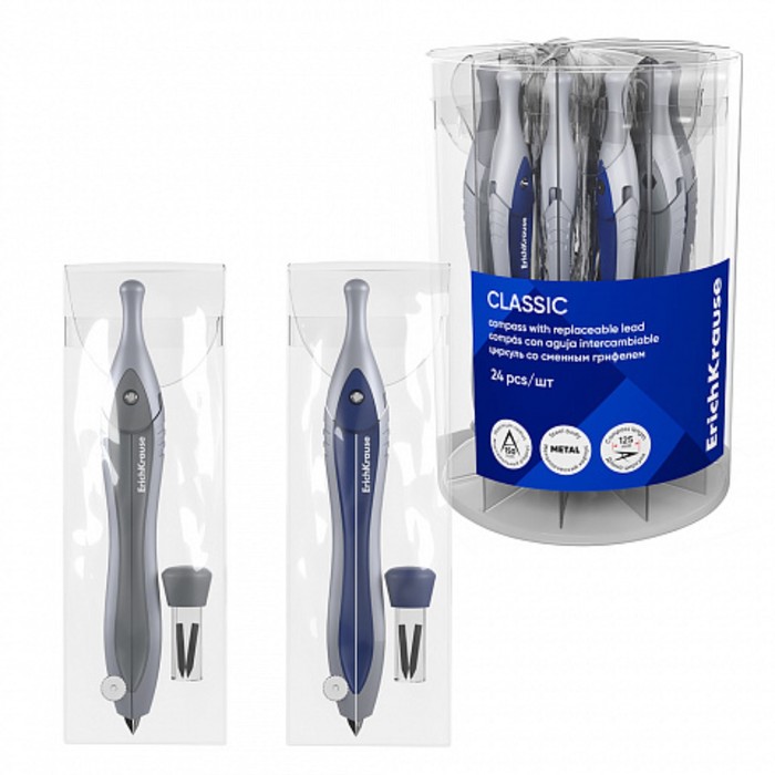 Циркуль металлический ErichKrause "Classic", 125мм, с карандашом, пенал, синий