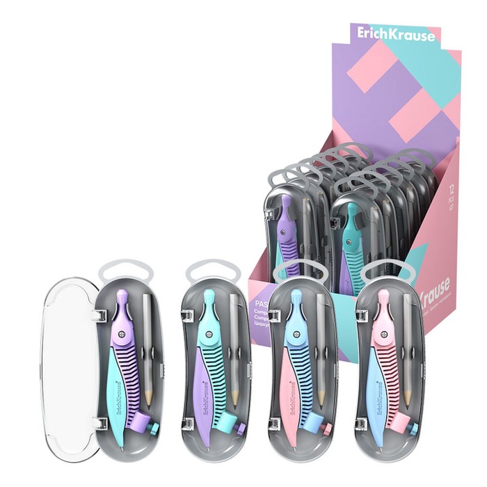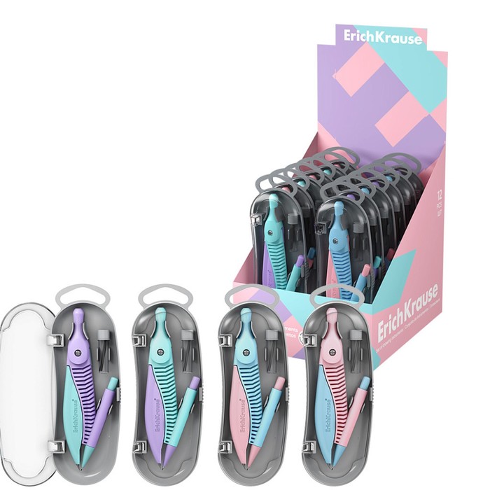 Циркуль пластиковый ErichKrause "Pastel", 122мм, с карандашом, пенал, микс