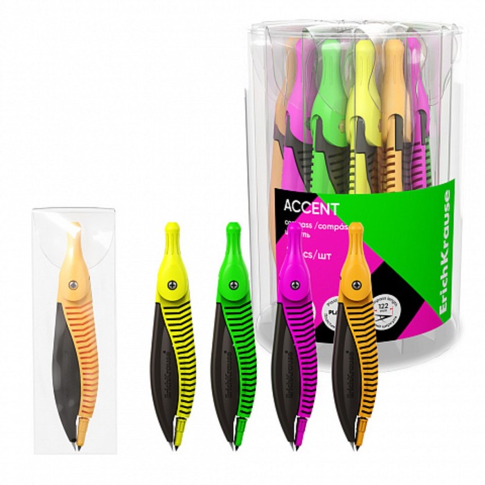 Циркуль пластиковый ErichKrause "Accent", 122мм, с карандашом, пенал, микс