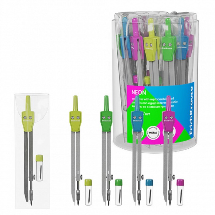 Циркуль металлический ErichKrause "Neon", 135мм, со сменным грифелем, PVC чехол, микс