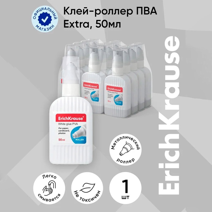 Клeй-роллер ErichKrause PVA, 50 мл, с металлическим роликовым аппликатором, подходит для бумаги, картона и ткани, морозостойкий