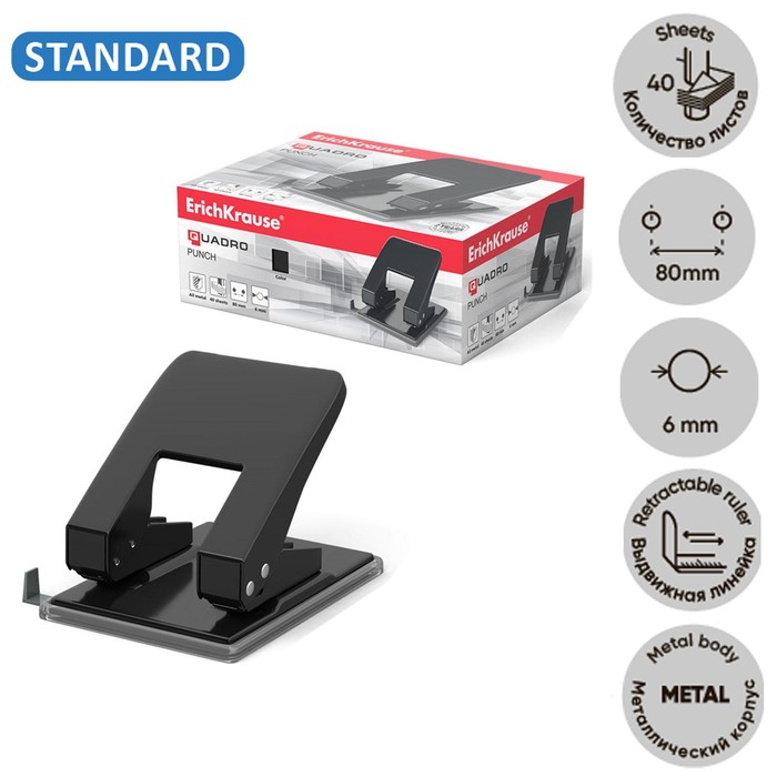 Дырокол до 40 листов ErichKrause Quadro, диаметр прокола 6 мм, расстояние между проколами 80 мм, чёрный