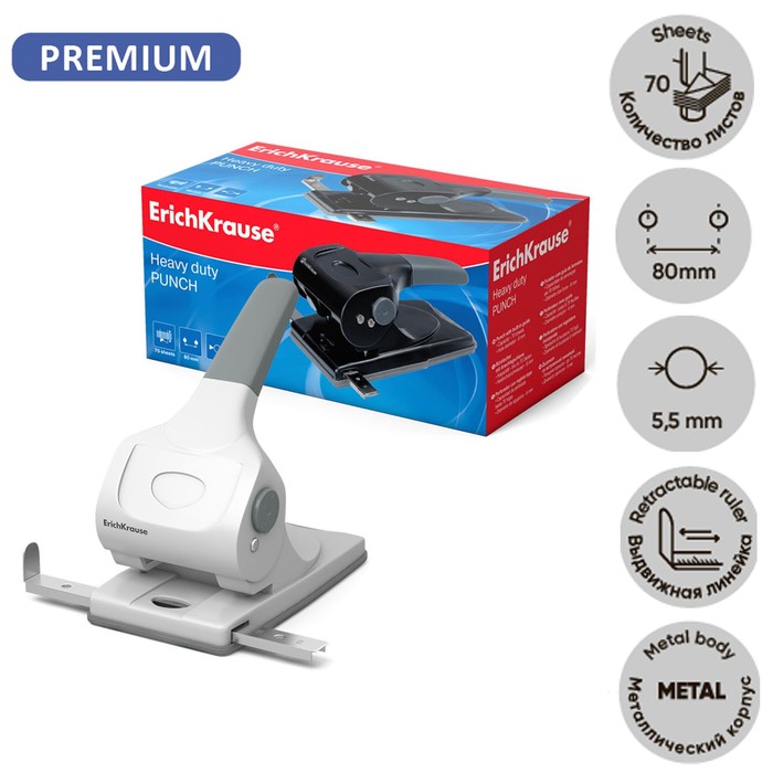 Дырокол мощный до 70 листов Erich Krause, с линейкой, серый, диаметр прокола 5.5мм, расстояние между проколами 80мм, белый