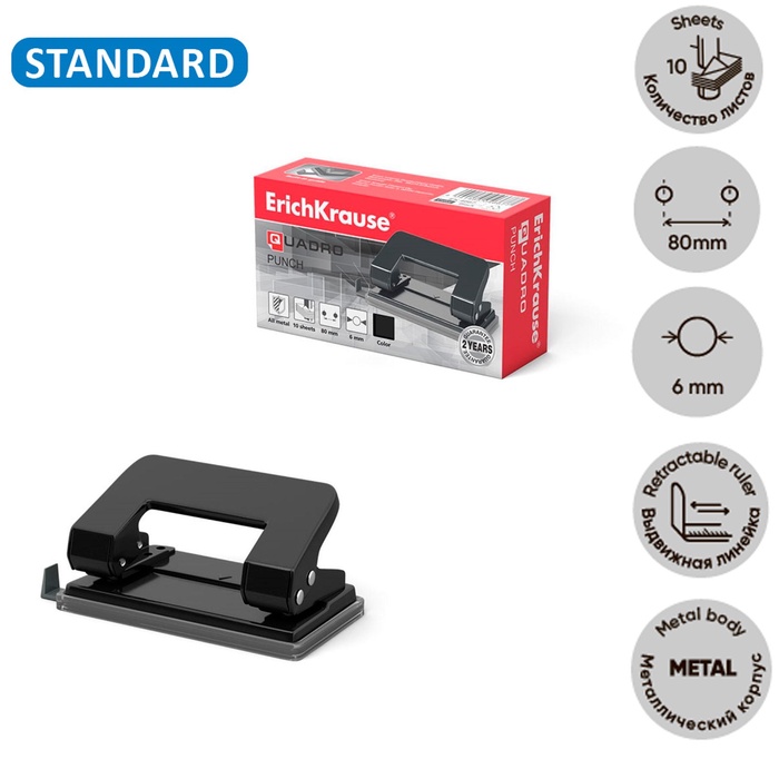 Дырокол ErichKrause Quadro, до 10 листов, диаметр прокола 6 мм, расстояние между проколами 80 мм, чёрный