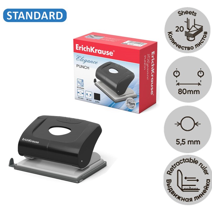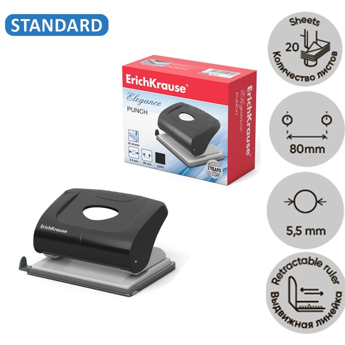 Дырокол ErichKrause Elegance, до 20 листов, диаметр прокола 5.5 мм, расстояние между проколами 80 мм, чёрный