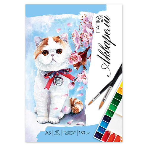 Планшет для акварели " Феникс " БОЛЬШОЙ ФОРМАТ А3 20л Весенний кот, белая акварельная бумага, среднее зерно, плотность 180г/м2, в папке