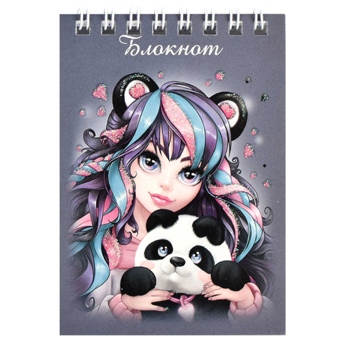Блокнот МАЛЫЙ ФОРМАТ А7 спираль сверху 40л " Феникс " Девушка с пандой, клетка, обложка - мелованный картон, выборочный УФ-лак, глиттер, белый офсет, 70*115мм