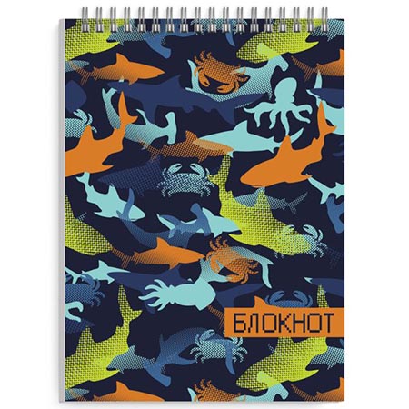 Блокнот А5 спираль сверху 60л " Феникс " Морская фактура, клетка, обложка - мелованный картон, УФ-лак, белый офсет, 145*200мм