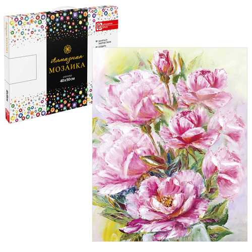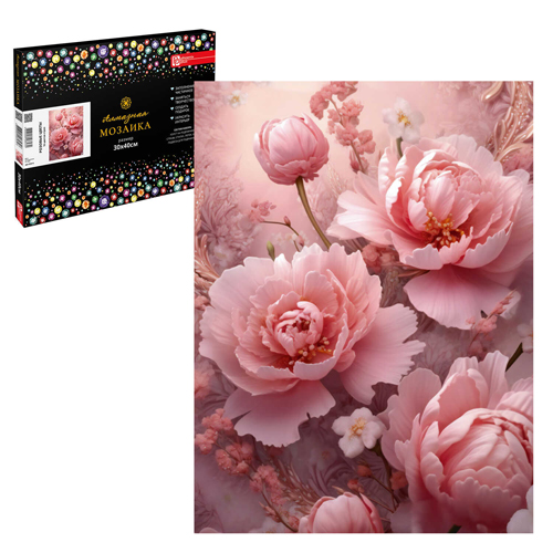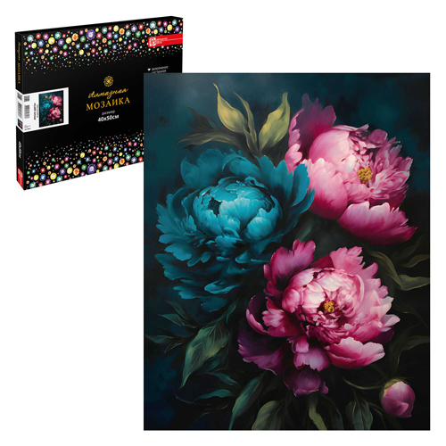 Картина алмазная " Феникс " 40*50см Букет из пионов, на подрамнике, с полным заполнением, в наборе: холст с эскизом на подрамнике, пакеты со стразами, лоток для страз, стилус, силикон для страз, клей, схема, подвесы для подрамника, дополнительные пакеты с