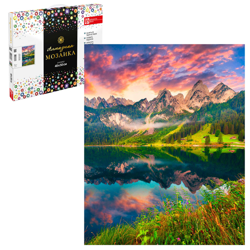 Картина алмазная " Феникс " 40*50см Горное озеро, на подрамнике, с полным заполнением, в наборе: холст с эскизом на подрамнике, пакеты со стразами, лоток для страз, стилус, силикон для страз, клей, схема, подвесы для подрамника, дополнительные пакеты с zi