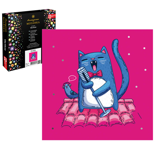 Картина алмазная " Феникс " 15*15см Кот-певец, на подрамнике, с частичным заполнением, в наборе: холст с эскизом, пакеты со стразами, лоток для страз, стилус, силикон для страз, клей, пинцет металлический, схема, дополнительные пакеты с zip-молнией, карто