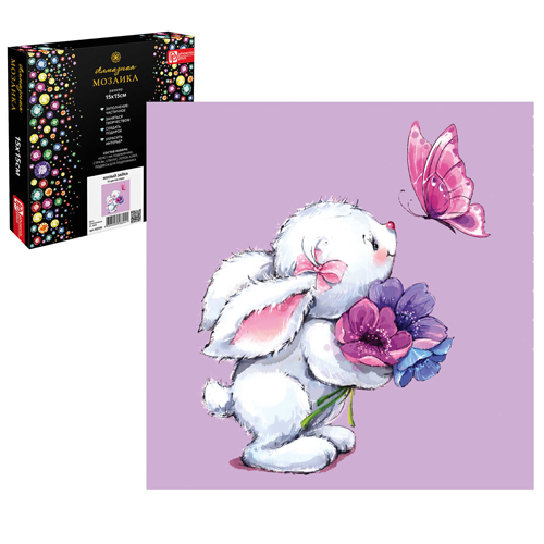 Картина алмазная " Феникс " 15*15см Милый зайка, на подрамника, с частичным заполнением, в наборе: холст с эскизом, пакеты со стразами, лоток для страз, стилус, силикон для страз, клей, пинцет металлический, схема, дополнительные пакеты с zip-молнией, кар