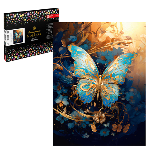 Картина алмазная " Феникс " 30*40см Бабочка в золоте, на подрамнике, с частичным заполнением, в наборе: холст с эскизом на подрамнике, пакеты со стразами, лоток для страз, стилус, силикон для страз, клей, пинцет металлический, схема, подвесы для подрамник