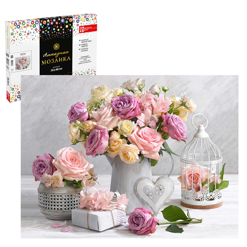Картина алмазная " Феникс " 30*40см Розовый букет, на подрамнике, с полным заполнением, в наборе: холст с эскизом на подрамнике, пакеты со стразами, лоток для страз, стилус, силикон для страз, клей, пинцет металлический, схема, подвесы для подрамника, доп