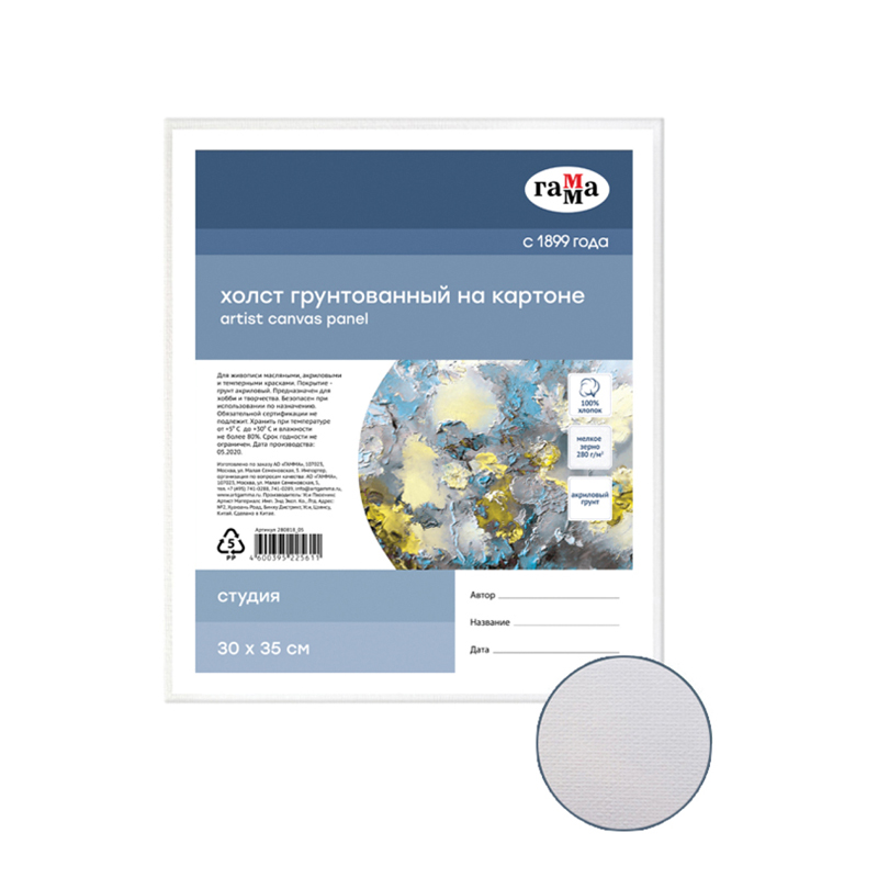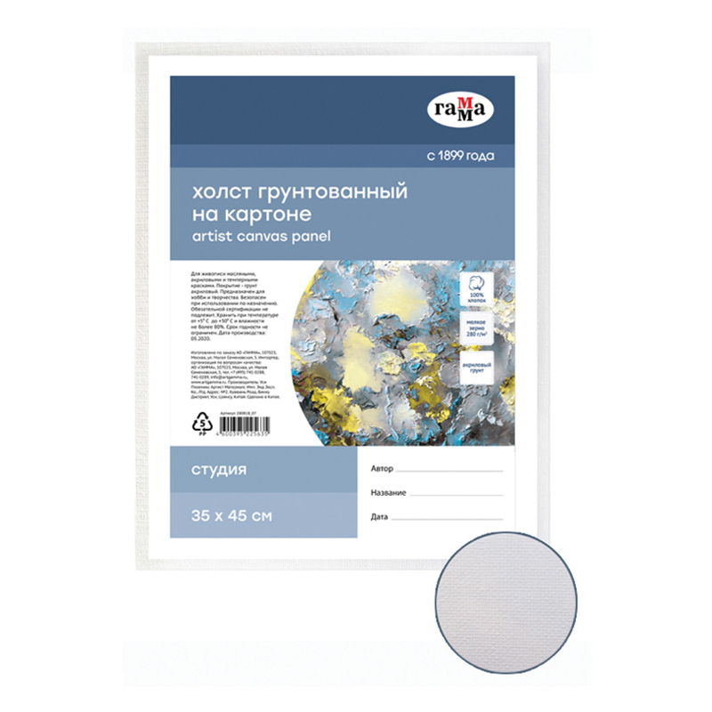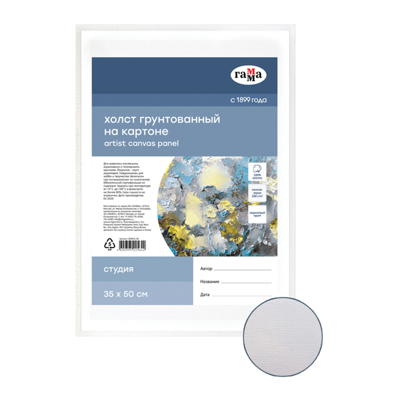 Холст на картоне Гамма "Студия", 35*50см, 100% хлопок, 280г/м2, мелкое зерно