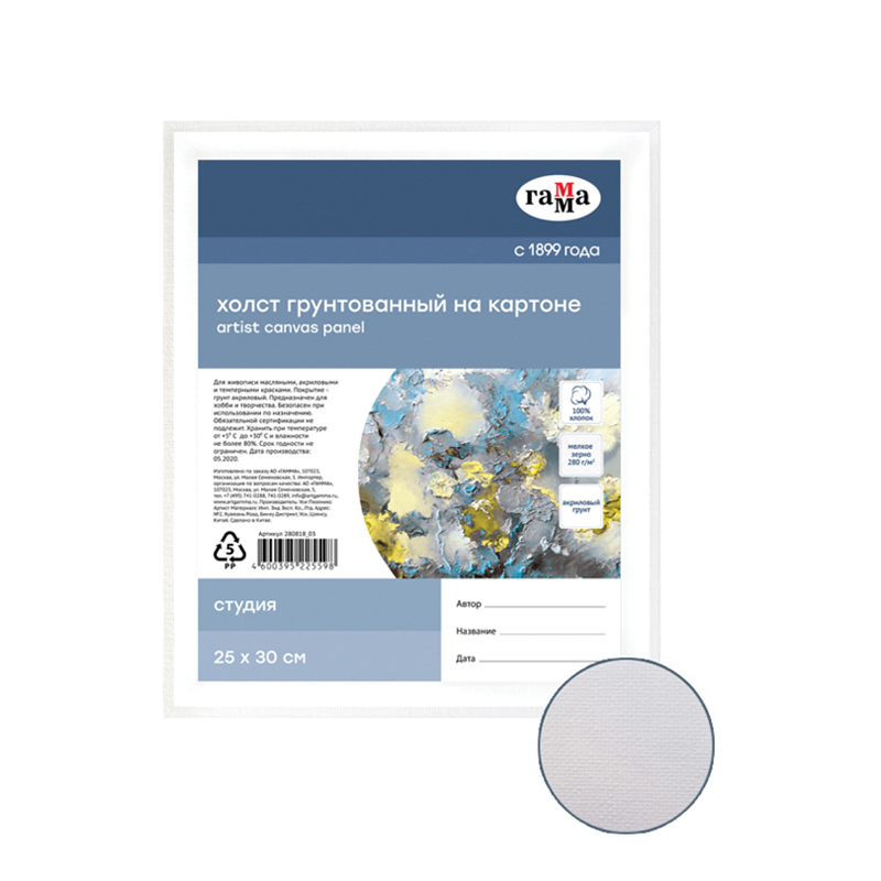 Холст на картоне Гамма "Студия", 25*35см, 100% хлопок, 280г/м2, мелкое зерно