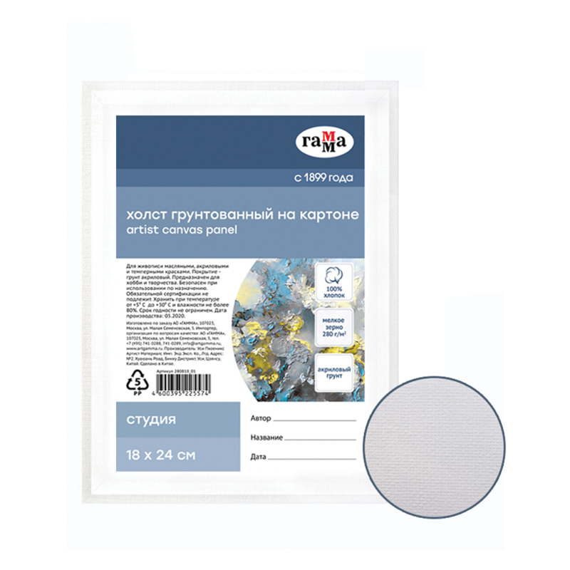 Холст на картоне Гамма "Студия", 18*24см, 100% хлопок, 280г/м2, мелкое зерно