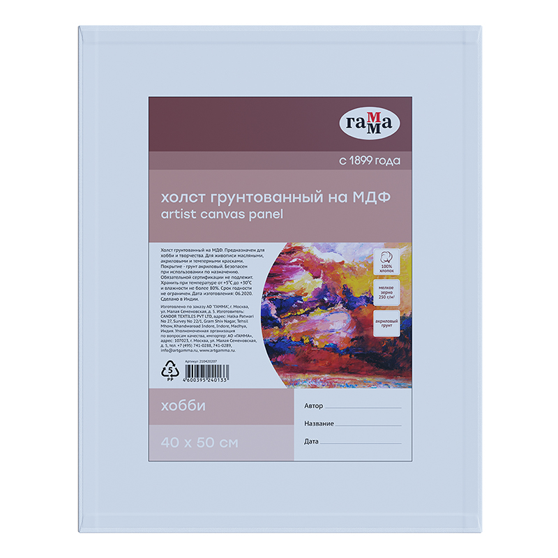 Холст на МДФ Гамма "Хобби", 40*50см, 100% индийский хлопок, 250г/м2, мелкое зерно