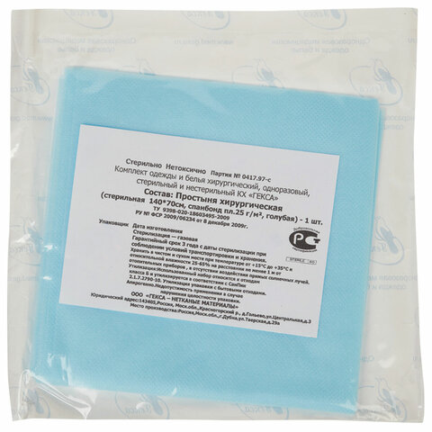 Простыня голубая стерильная 140х200 см, спанбонд 25 г/м2, ГЕКСА