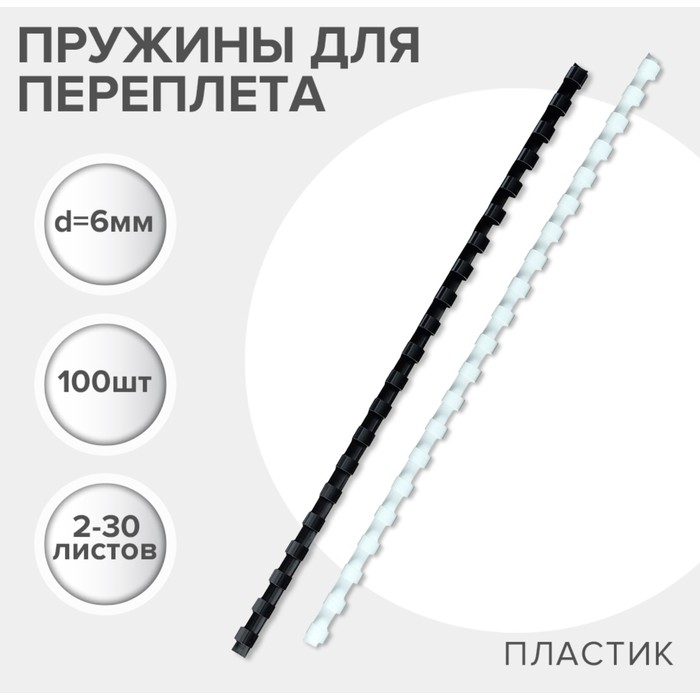 Пружины для переплета пластиковые, d=6мм, 100 штук, сшивают 2-30 листов, белые/чёрные, Гелеос