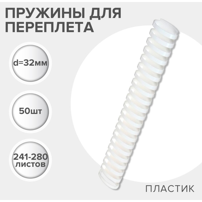 Пружины для переплета пластиковые, d=32мм, 50 штук, сшивают 241-280 листов, белые, Гелеос