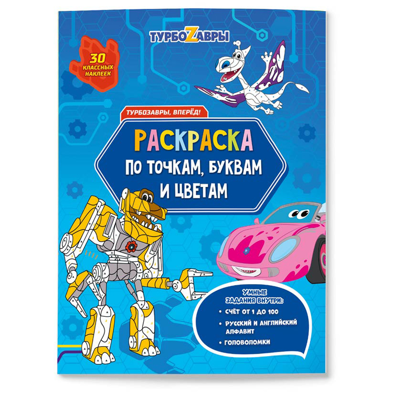 Раскраска по точкам и цифрам 210*280 ГЕОДОМ "Турбозавры, вперед", 26стр., с наклейками