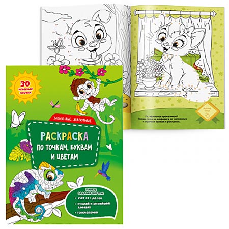 Раскраска по точкам буквам и цветам " ГеоДом " А4 13л с наклейками Забавные животные, обложка- мелованный картон