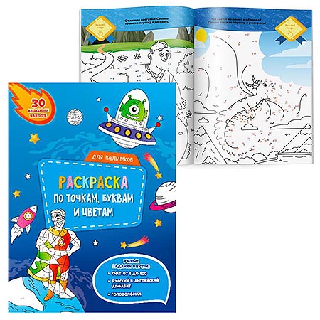 Раскраска по точкам буквам цветам " ГеоДом " А4 13л с наклейками Для мальчиков, обложка- мелованный картон